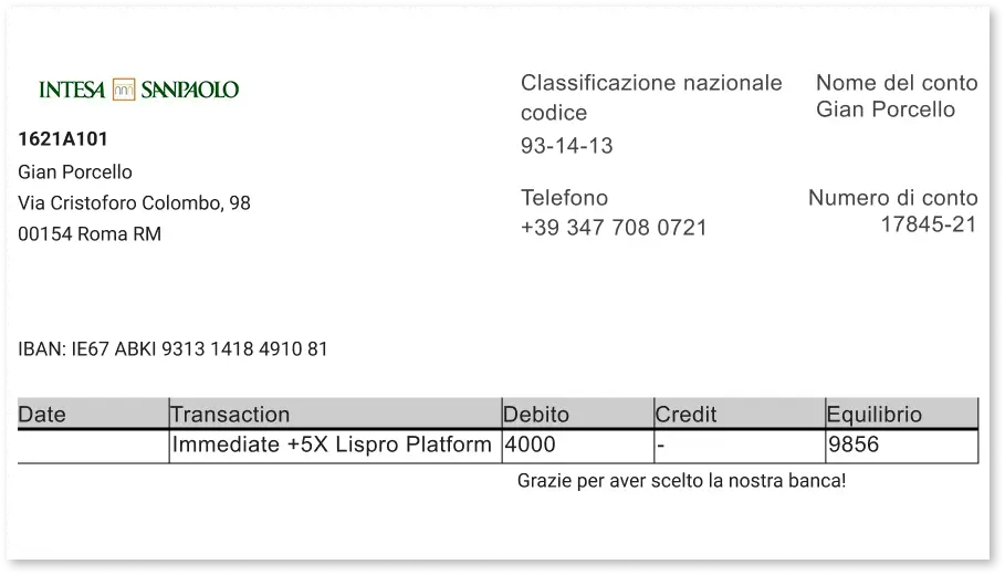 “Estratto conto ufficiale della banca che conferma l'accredito del denaro sul conto corrente Immediate +3X Lispro funziona davvero! Se non avessi ritirato i miei profitti, credo che 250 euro si sarebbero trasformati in un milione dopo 11 settimane. Ed è disponibile proprio adesso. Puoi fare lo stesso — se decidi di farlo.”