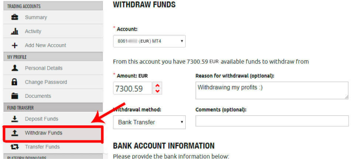 Come puoi vedere dalla schermata qui sotto, ho deciso di utilizzare la funzione "withdraw funds". per prelevare €7.300,59 dal conto.